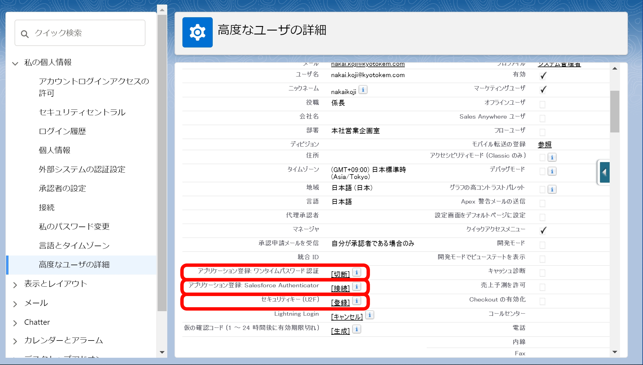 - このオプションが標準では表示されない、Salesforce システム管理者でセキュリティキーの使用を無効有効にします。下記記事参照